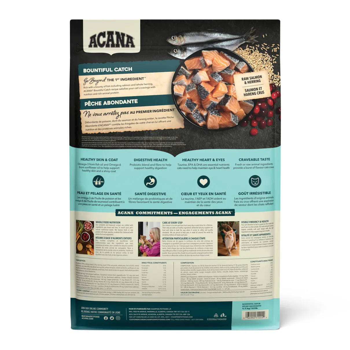 Specially crafted with a bounty of fish, our ACANA™ Bountiful Catch Recipe satisfies your cat with rich fish ingredients. Rich with 65% quality animal ingredients1 including raw salmon and whole herring, Bountiful Catch has the animal protein your cat needs to be their best. This nutrient-dense recipe also helps support key health benefits for your cat, including healthy skin & coat, healthy heart & eyes and digestive health. Nurture your feline with a fish-forward recipe tailored to keep them healthy and happy with ACANA Bountiful Catch!