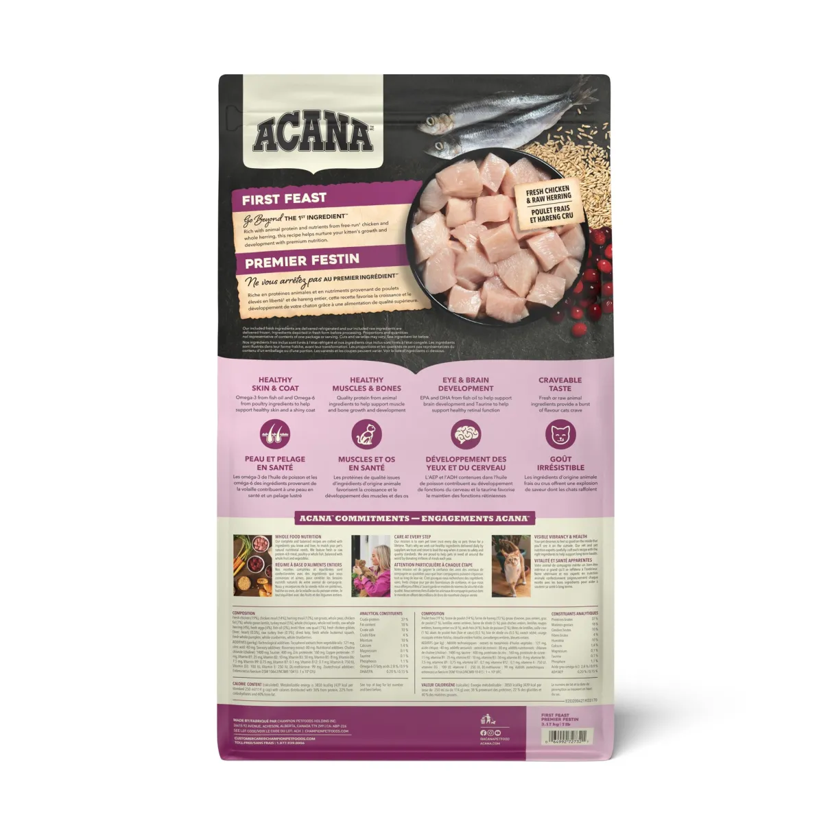 Specially crafted for your kitten, our ACANA™ First Feast Recipe helps support your kitten’s growth and development. Rich with 70% quality animal ingredients1 including fresh or raw free-run2 chicken and whole herring, First Feast has the animal protein your kitten needs to grow up strong. This nutrient-dense recipe also helps support key health benefits for your kitten, including healthy skin and coat, healthy muscles and bones, and eye and brain development. Nurture your kitten with a recipe tailored to help them grow up healthy and happy with ACANA First Feast!