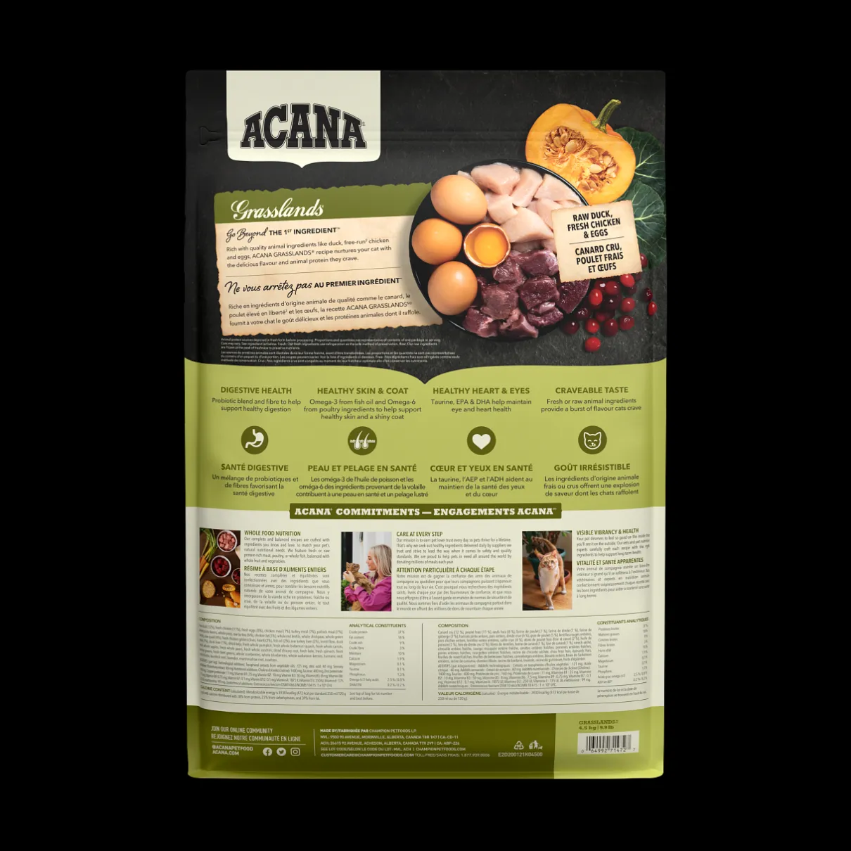 Rich with the highest level of animal protein1, our ACANA™ Highest Protein Grasslands Recipe will satisfy your cat completely with its rich duck and poultry ingredients and flavour. Crafted with 75% animal ingredients2 including duck, free-run3 chicken and turkey, and eggs , this recipe provides your cat with a variety of nourishing animal protein. This nutrient-dense recipe also helps support key health benefits including your cat’s digestive health, healthy skin & coat, and healthy heart & eyes. Nurture your feline completely with the rich animal protein and nutrition in ACANA Highest Protein Grasslands Recipe!