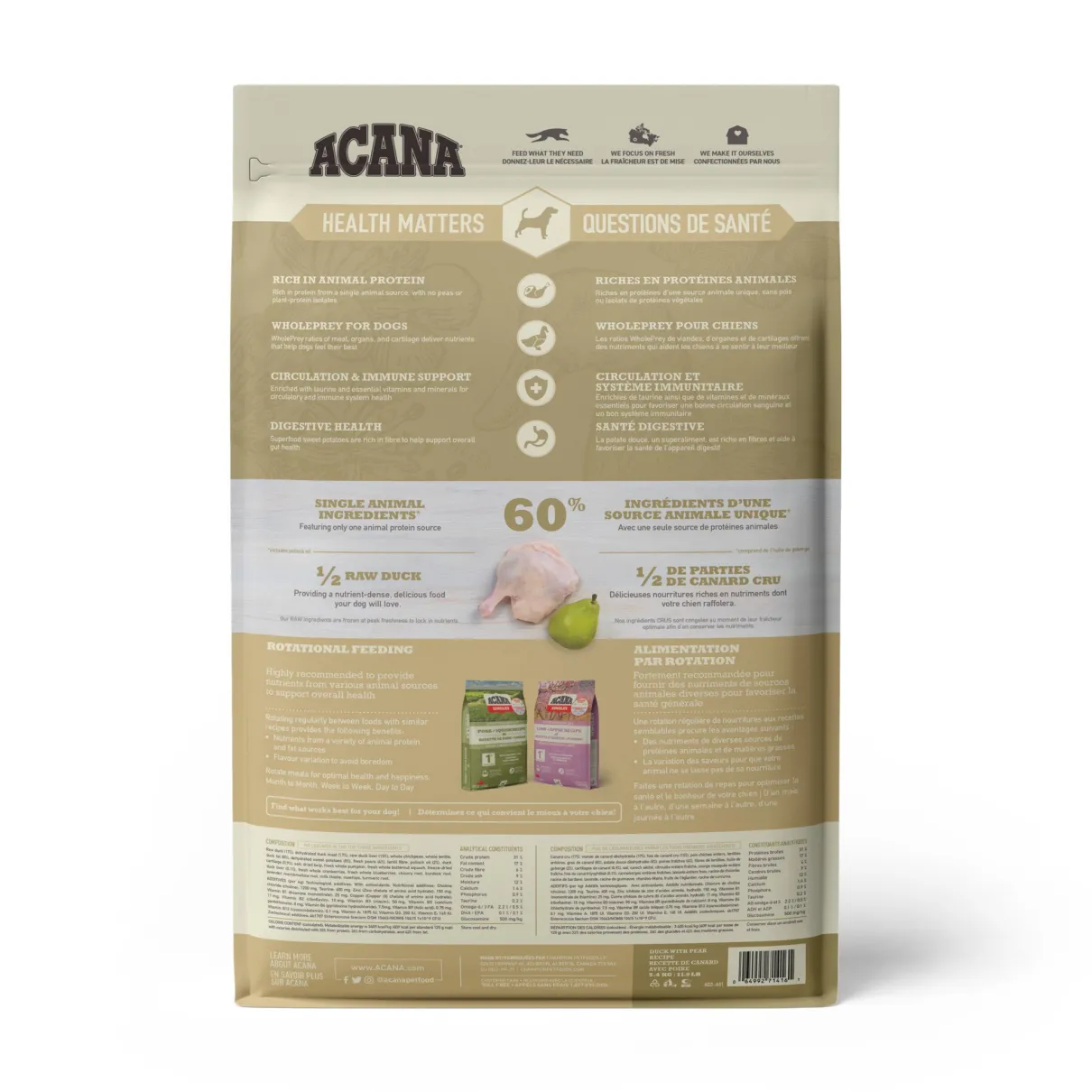 ACANA DUCK WITH PEAR RECIPE dog food is formulated to meet the nutritional levels established by FEDIAF for All Life Stages excluding growth of all large size dogs.