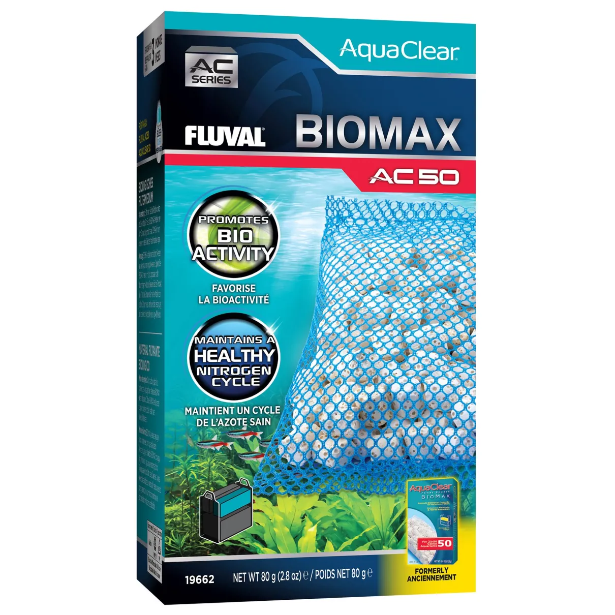 Fluval AquaClear 50 BioMax Filter Insert provides an optimal environment for the colonization and growth of beneficial bacteria, which is essential for effective biological filtration and water purification. BioMax’s complex bio-ring pore structure allows beneficial, toxin-reducing bacteria to thrive. By reducing toxins such as ammonia and nitrite, BioMax effectively increases biological filtration efficiency by 30%. Exclusively designed for the AquaClear 50 Power Filter, BioMax is suitable for fresh and saltwater aquariums. BioMax comes in a mesh bag for quick and easy installation.