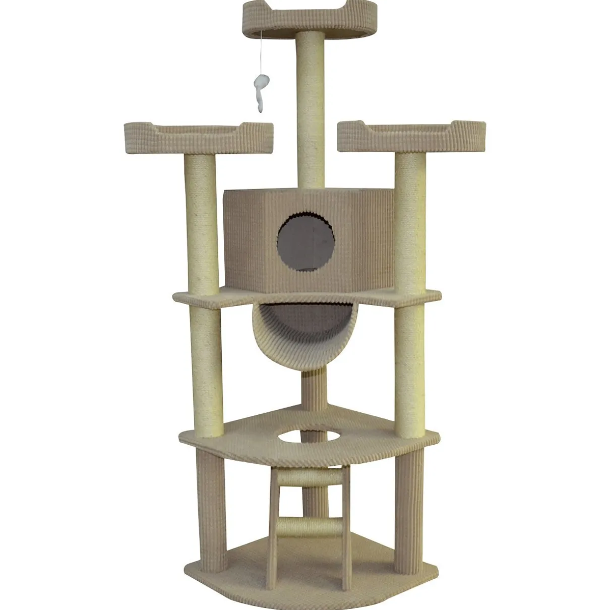 Every feline owner knows that cats love to climb and scratch their furniture. These actions are in their nature! Animal Treasures New Yorker Cat Tree Scratcher provides your feline with a designated space where climbing, scratching, playing and sleeping are appropriate. The New Yorker Cat Tree features three pillar scratch posts that run throughout the entire tree, where felines can mark their territory by scratching, trimming and cleaning their nails. Another scratch post that arises from the base helps to support the sleeping hideout on the third level. On the first level is a ladder leading to two of the upper most pillar scratchers where you will find resting platforms with hiding holes and scratching areas. Above the third level, three resting towers with raised edges are available, with a dangling toy hanging from the middle island. These platforms allow your felines to view their domain and observe the environment like they would normally do in the wild. The second and third levels contain darker hiding spots designed to satisfy cat’s innate desire for hiding in crawlspaces.. This stylish New Yorker has warm and woven brown toned colors that will look great in any space. Bring the New Yorker Cat Tree home and give your felines a space of their own, where they can do what cats do best!