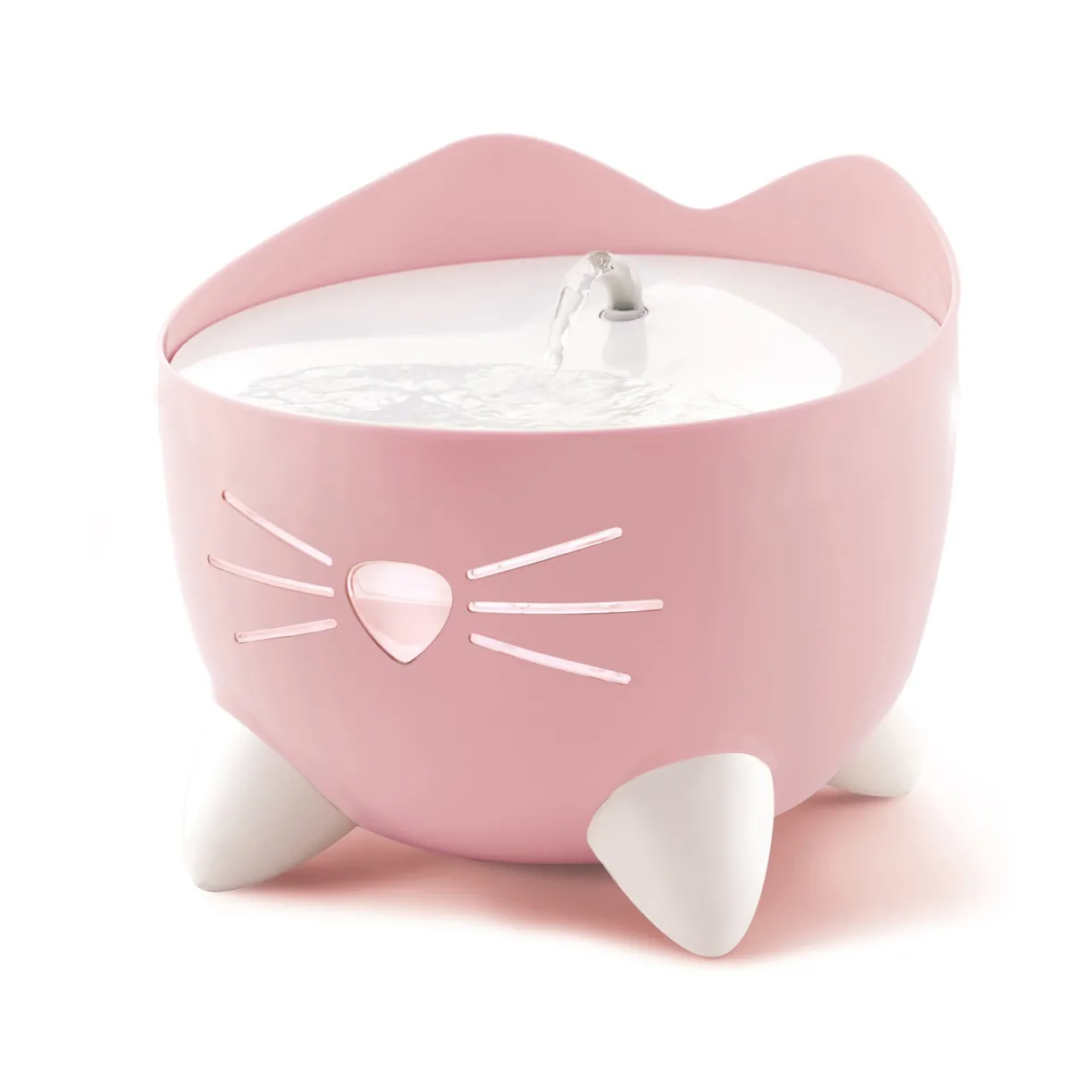 The Catit PIXI fountain stimulates picky cats to drink with ergonomic drinking options. Fountain filter softens water and removes debris. Features LED status alerts and auto-shutdown. Quiet pump.