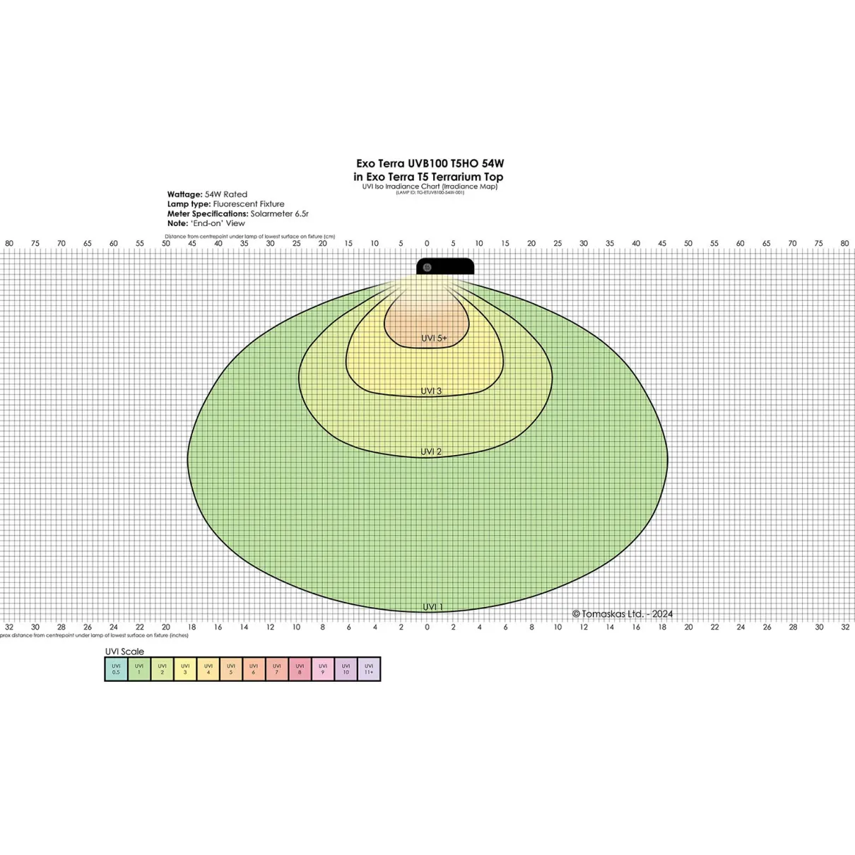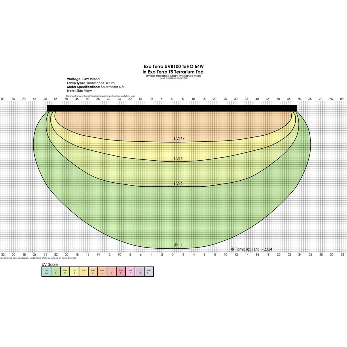 Exo Terra®’s exceptional T5 lamps are crafted in Germany to the highest quality standard, ensuring a prolonged UV output of 12+ months for lasting performance. With its intense output of UVA and UVB rays – combined with a well-balanced visible light spectrum – the Exo Terra® Reptile UVB100 T5 Very High Output Bulb is specifically designed to meet the needs of reptiles, amphibians and invertebrates inhabiting the Cryptophotic Zone. The intensity of the emissions varies depending on the distance from the basking area.