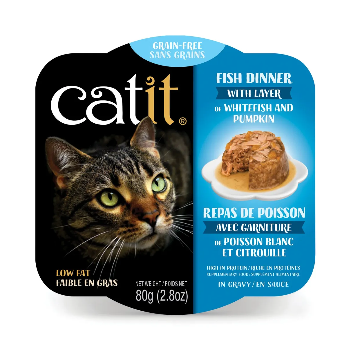 Catit Fish Dinner is a dual-layered wet food, made of fresh ingredients served in luscious gravy. This low-fat cat food is natural, high in protein and grain-free, with added vitamins and minerals for precisely balanced nutrition.