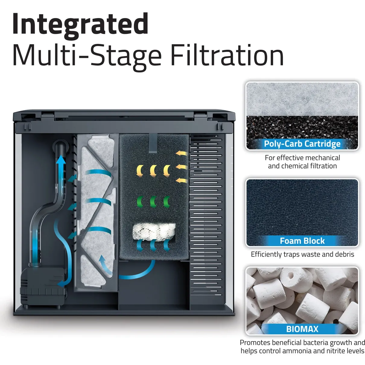 Discover the ultimate in freshwater aquarium design and flexibility with the new and improved Flex 2.0 Series. Imagine customizable RGB + White LED lighting for endless color blends and mesmerizing effects. Picture a reconfigured, integrated filtration system with adaptable water output options. The latest Flex generation makes this a reality and even takes convenience to the next level with several new cover enhancements.