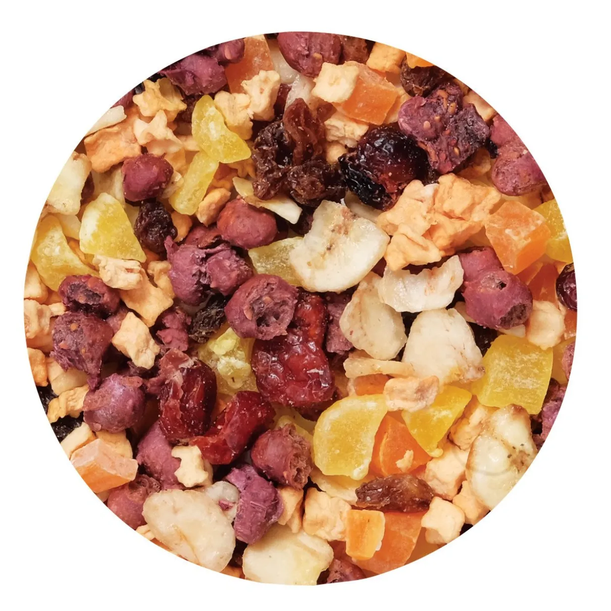 Dried apple, dried banana, dried papaya, dried pineapple, raisins, dried cranberry, blueberry pomace, cranberry pomace, elderberry pomace, wheat, citric acid, mixed tocopherols, rosemary extract.
