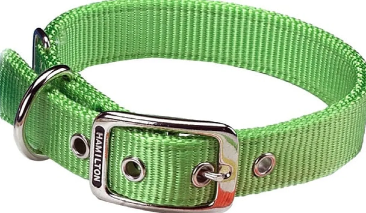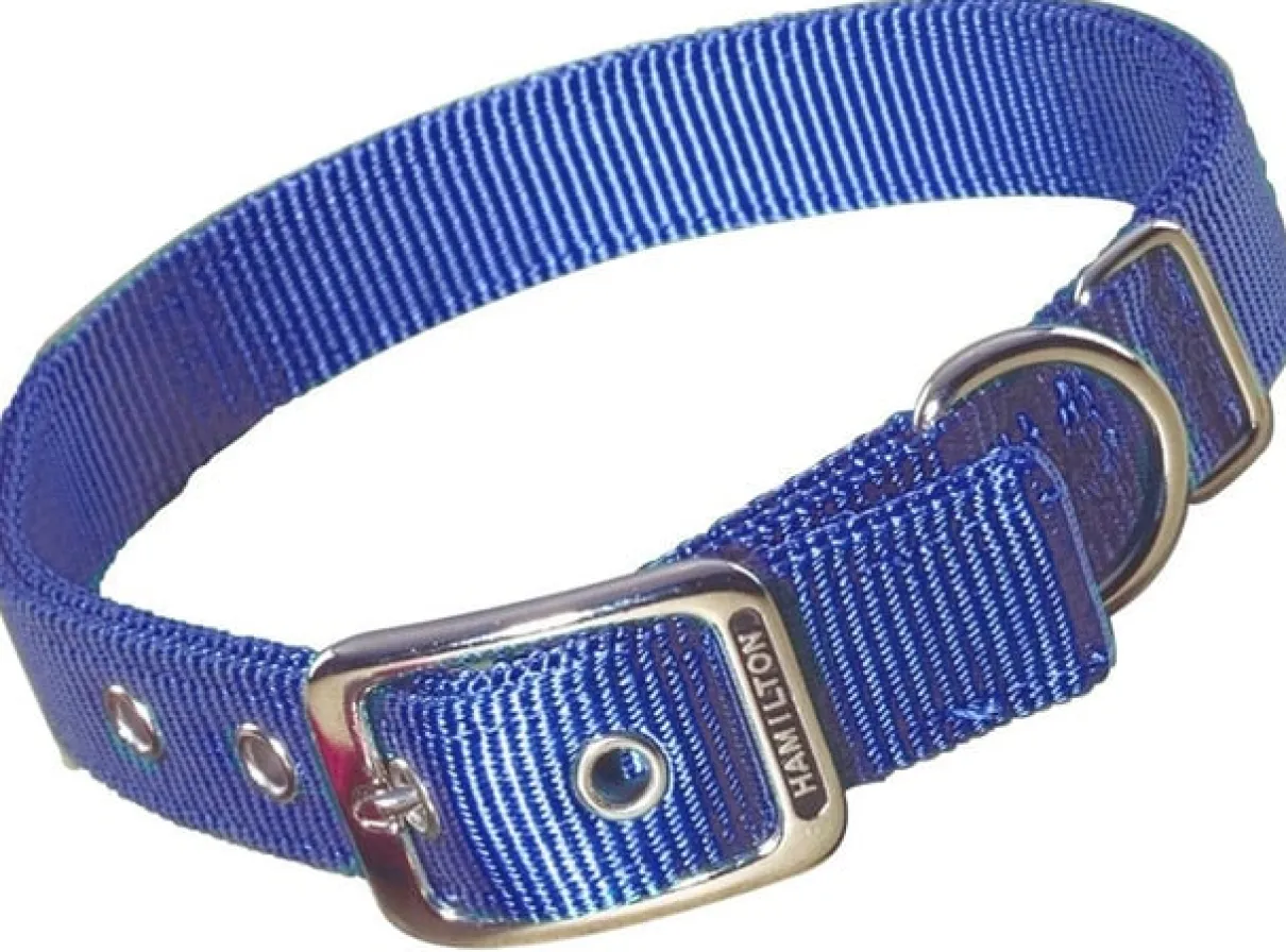 Hamilton 1-inch by 20-inch double thick nylon deluxe dog collar is constructed with custom dyed webbing to reduce fading and bleeding. 100-Percent first run webbing is used to outperform others in strength, flexibility and durability. The high thread count results in an unmatched feel. All cuts are finished away from dog’s neck to avoid irritation. Shoe grade construction eyelets enhance look and eliminate fraying.