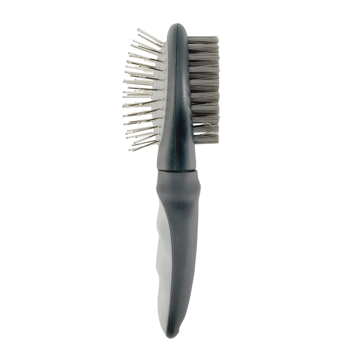 A 2-in-1 grooming brush that removes dead hair while penetrating deep into the coat to lift out dirt and debris. Gray nylon bristles, steel pins, gray pad, charcoal handle. Suitable for the general grooming of most breeds.