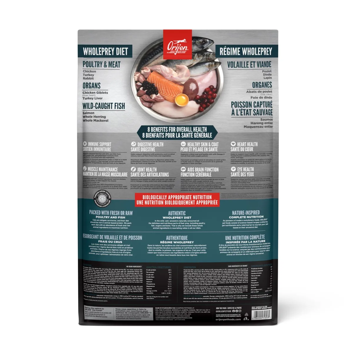 ORIJEN™ Guardian 8™ is a nourishing food specially formulated to address 8 common cat concerns through quality ingredients. Because of the abundance of fresh and raw WholePrey animal ingredients in this diet, less supplementation is needed to support your cat’s health for a lifetime. With 90%* premium animal ingredients, and 2/3 of those being fresh and raw, Guardian 8 contains nutritious ingredients that help support your cat’s overall health with 8 benefits. These benefits include Immune support, Digestive health support, Healthy skin & coat support, Muscle maintenance, Heart health, Joint health, Brain & cognitive function, and Eye health.