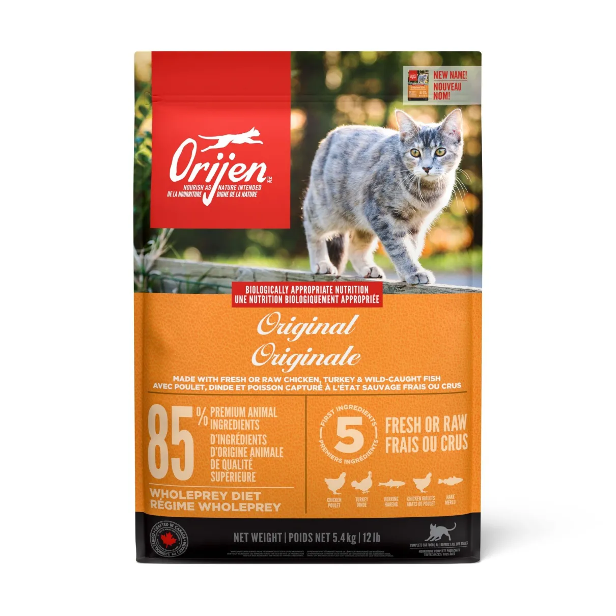 Help your cat thrive with the power of protein-rich recipes that provide peak nourishment. As obligate carnivores, modern cats are built like their ancestors and thrive on a Biologically Appropriate diet rich in protein and fat sourced from a variety of animal ingredients. ORIJENĀ® Original Cat diet is made with fresh or raw1 free-run2 chicken and turkey and wild-caught fish. Packed with WholePrey animal ingredients like poultry, fish, organs and bone, ORIJEN Original Cat diet is made with the most nutrient-dense, succulent parts of the prey to deliver the nutrition cats need. With 85%3 quality animal ingredients and a freeze-dried liver coating, this diet is beyond comparison.