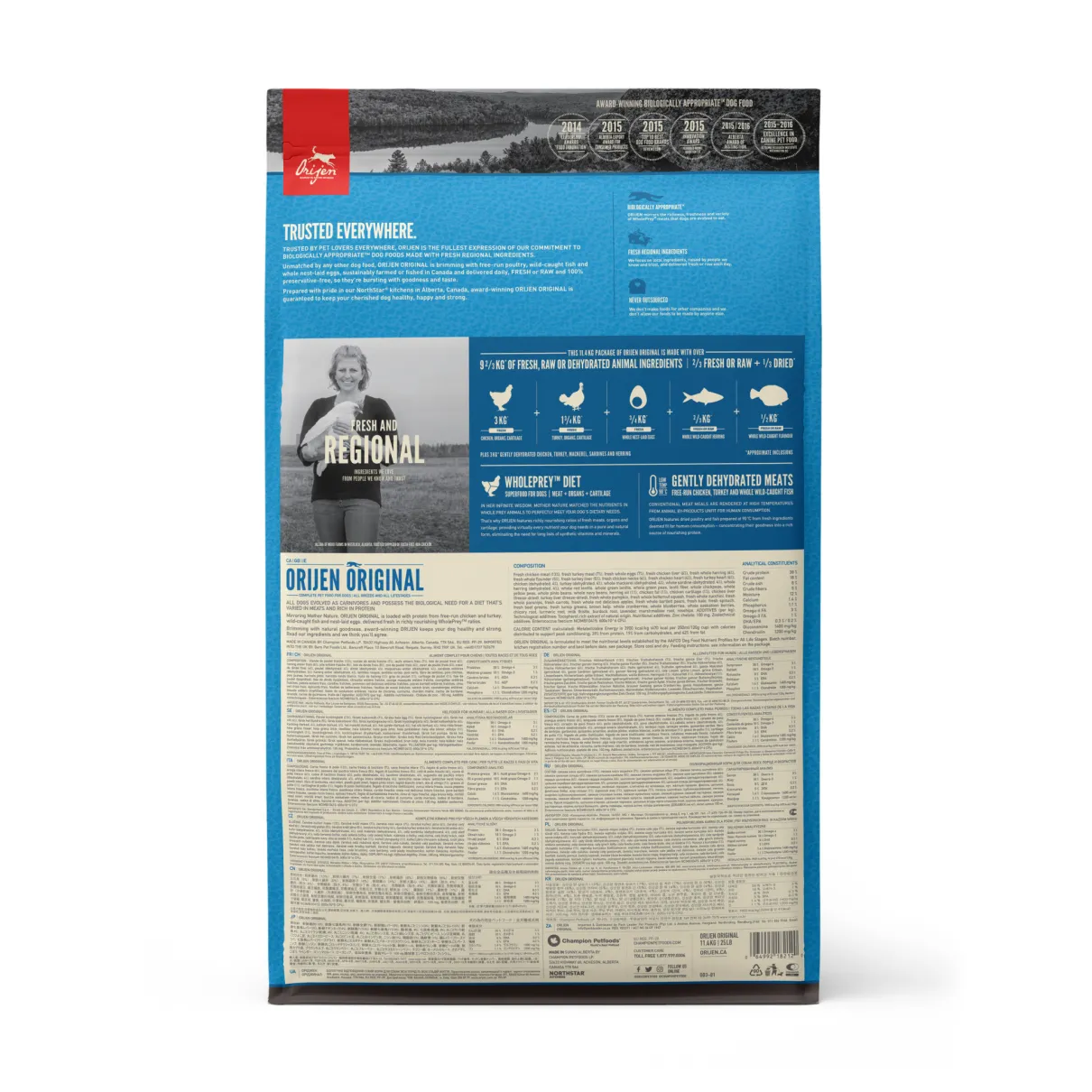 Just like their ancestor, the grey wolf, all dogs are meant to eat a diet rich and varied in whole animal ingredients. ORIJEN Original is made with meat, organs, cartilage, and bone from free-run chicken and turkey, wild-caught fish, and cage-free eggs that are delivered to our kitchen. Two-thirds of our animal ingredients are FRESH or RAW, for a concentrated source of protein. With richly nourishing protein and infusions of freeze-dried liver, this recipe nourishes your dog as nature intended while offering them a flavour that they’ll love.