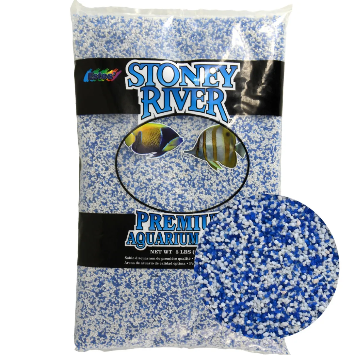 Estes Stoney River Premium Aquarium Sand is colored, pH neutral and non-toxic, making this an ideal sand for all marine and freshwater tanks. Beautiful and fine, this substrate is clean and low-maintenance. Mix of Blue and White sand, 5lbs of sand content.