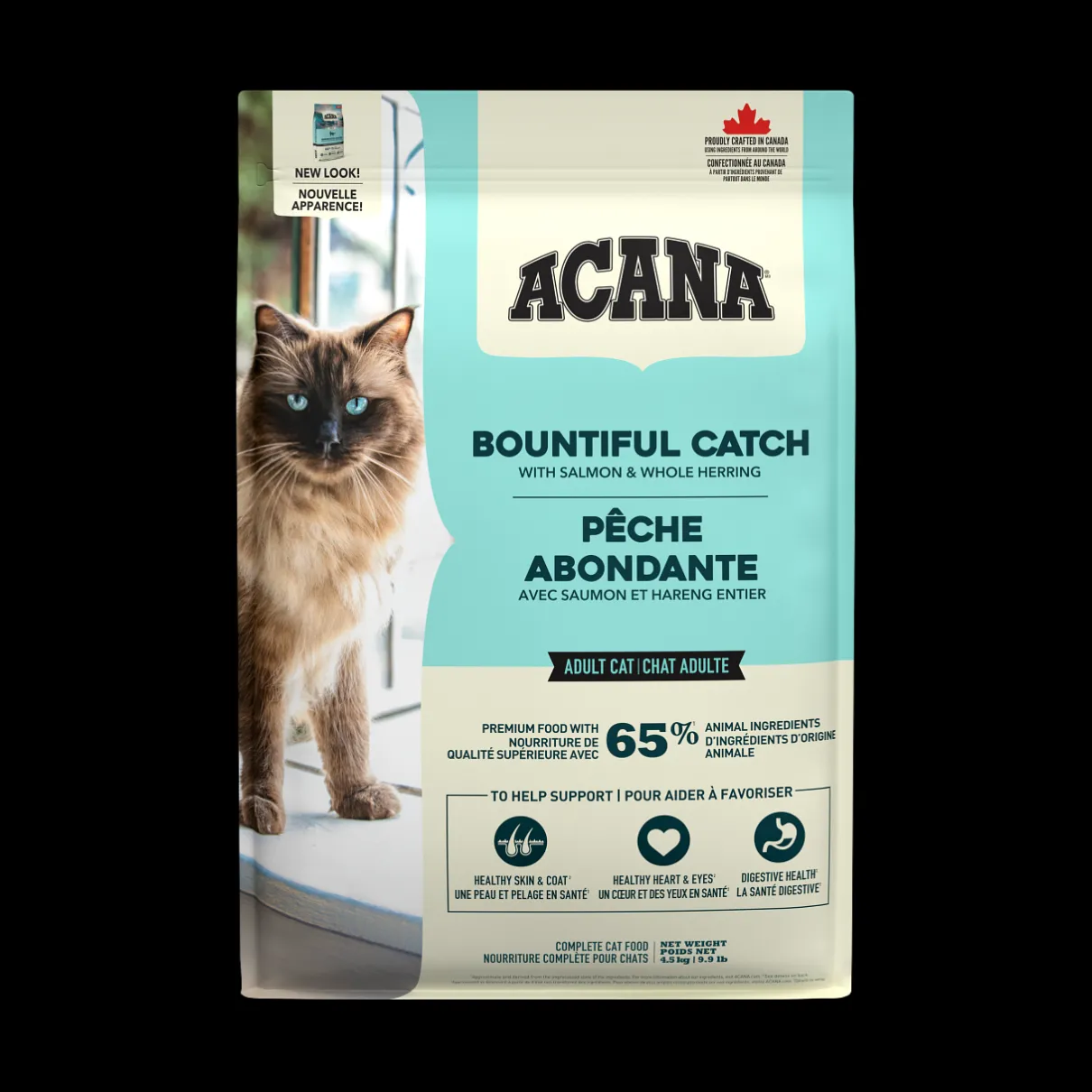 Specially crafted with a bounty of fish, our ACANA™ Bountiful Catch Recipe satisfies your cat with rich fish ingredients. Rich with 65% quality animal ingredients1 including raw salmon and whole herring, Bountiful Catch has the animal protein your cat needs to be their best. This nutrient-dense recipe also helps support key health benefits for your cat, including healthy skin & coat, healthy heart & eyes and digestive health. Nurture your feline with a fish-forward recipe tailored to keep them healthy and happy with ACANA Bountiful Catch!