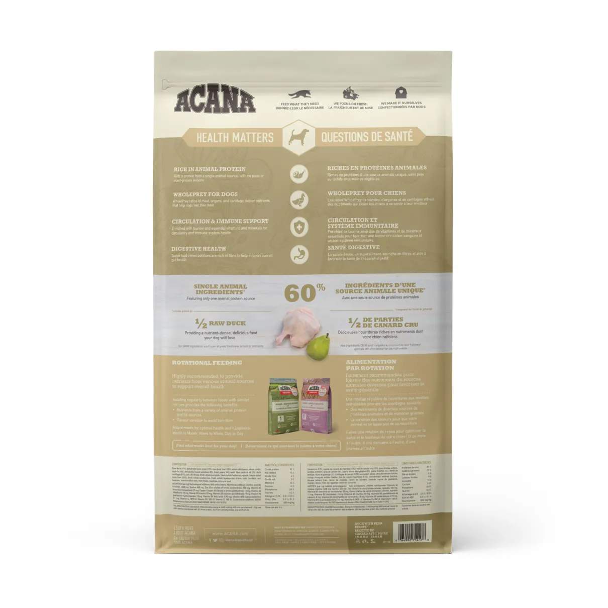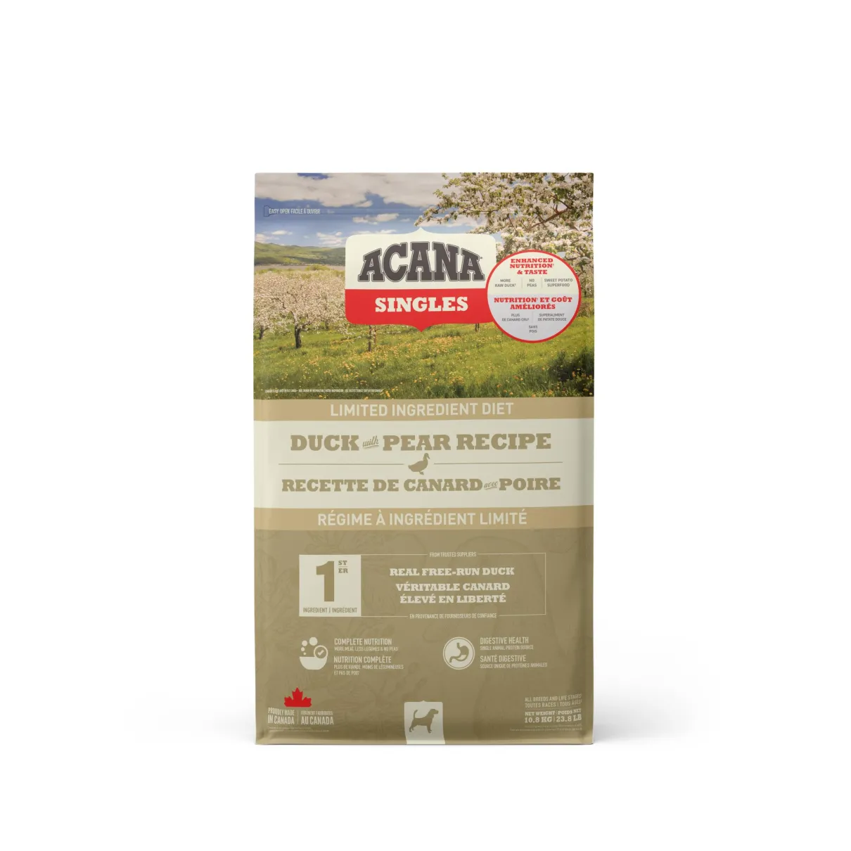 Our Best Recipe Ever! ACANA Singles Duck with Pear Recipe is now loaded with more meat, less legumes, and no peas for enhanced nutrition and taste your dog will love! Our Limited Ingredient recipe includes 60% quality duck ingredients in WholePrey ratios of duck, organs, and cartilage, complemented with fresh pears, providing your dog with the protein and nutrients they need in order to stay happy, healthy, and strong.