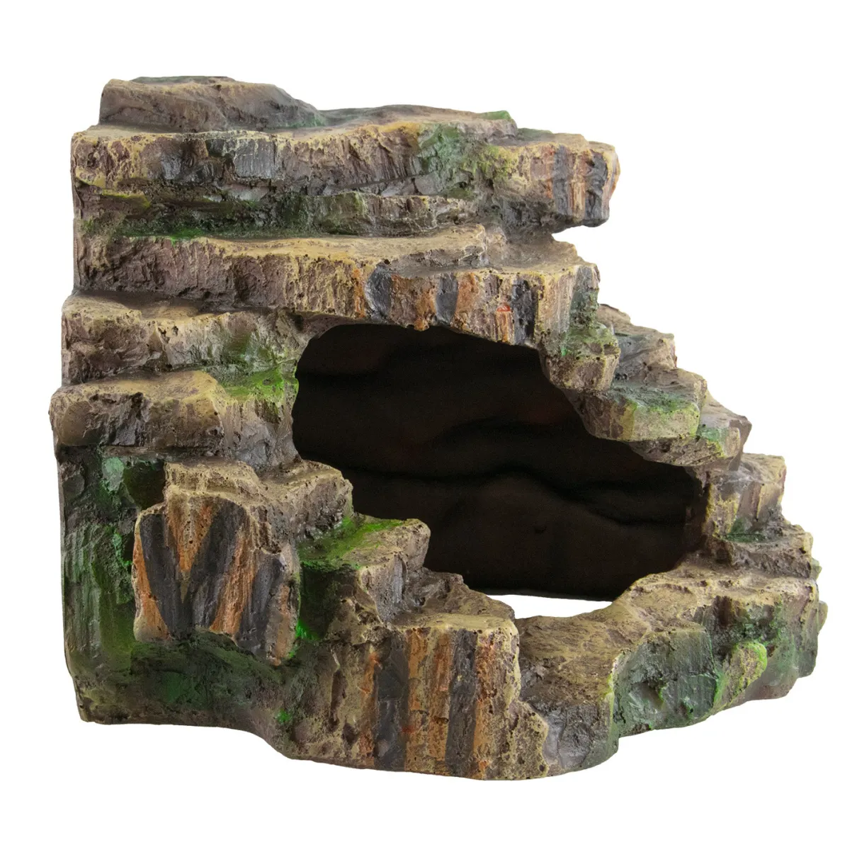 This natural resin terrarium accessory offers a safe, eco-friendly, and easy-to-maintain solution for pet owners. Its structure optimizes space utilization in the terrarium while delivering a realistic aesthetic with finely crafted rock and nature details. This multi-functional design also serves as a reptile habitat decoration, pet drying platform, and humidification hideout. Its non-polluting, durable nature makes it a trusted choice for climbing pets, ensuring peace of mind for pet owners. 10″ x 9″ x 8″