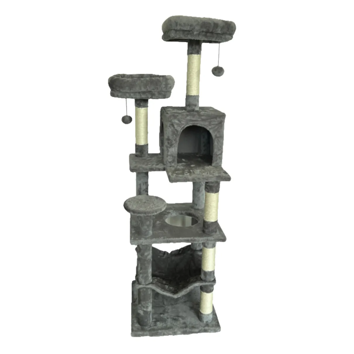 Introducing Animal Treasures Lounge Duke! This multi-level cat tower features a cozy house for naps and privacy, a hammock, several durable scratching posts to keep claws healthy and furniture safe, hanging toy balls, and several elevated platforms for climbing and exploring. Crafted with high-quality materials and a sleek, modern design, it’s not only functional but also a stylish addition to any home. Whether your cat loves to lounge, scratch, or play, this tower provides endless entertainment and comfort for your beloved pet.