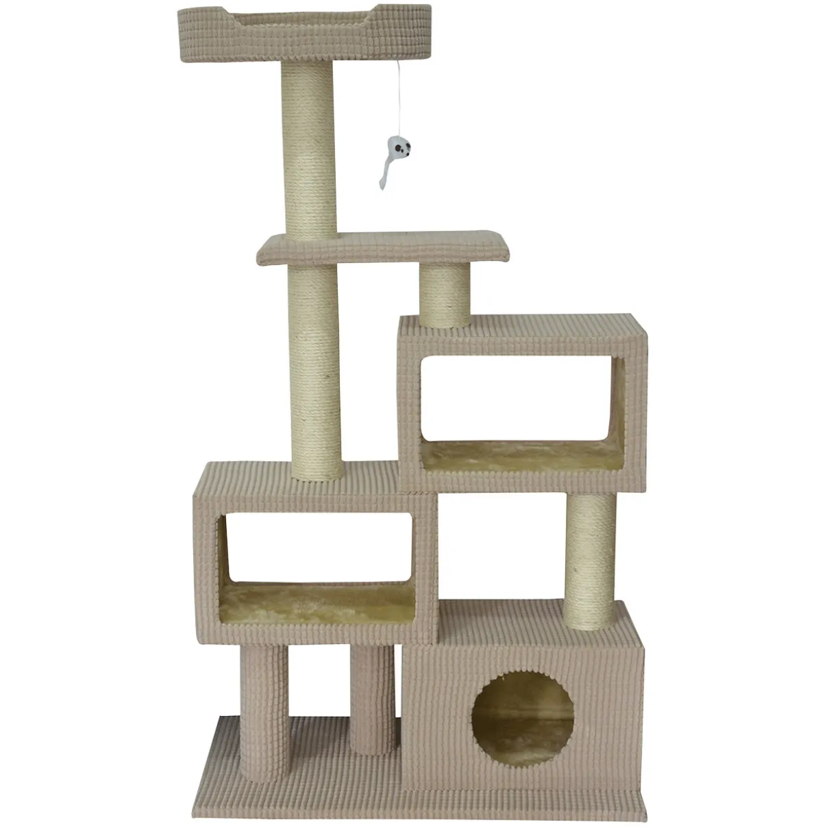 Every feline owner knows that cats love to climb and scratch their furniture. These actions are in their nature! Animal Treasures Tower Condo Cat Tree Scratcher provides your feline with a designated space where climbing, scratching, playing and sleeping are appropriate. The Tower Condo Cat Tree features several pillar scratch posts throughout the entire structure, where felines can mark their territory by scratching, trimming and cleaning their nails. The uneven rectangular structure of this cat tree provides a fun experience for the adventurous cat. On the first level is a dark resting hole surrounded by comfortable fabric and scratchable walls. Above the first level, two open aired resting areas are available for cats to relax and nap in. The topmost tower allows your felines to view their domain and observe the environment like they would normally do in the wild. Below this topmost tower dangles a fluffy toy mouse, perfect for playtime. This stylish Tower Condo has warm and woven brown toned colors that will look great in any space. Bring the Tower Condo Cat Tree home and give your felines a space of their own, where they can do what cats do best!