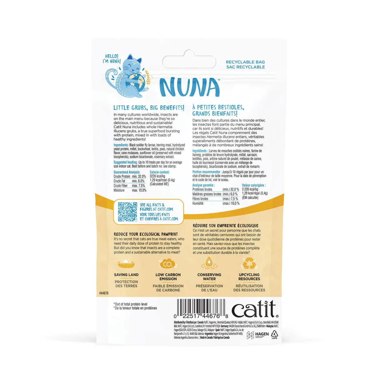 Catit Nuna treats are part of our insect protein-based Catit Nuna food range. These premium cat treats are the perfect alternative to unsustainable meat-based treats. Easily digestible and extremely palatable, this revolutionary treat is loved by cats and offers an opportunity for us cat lovers to make a difference.