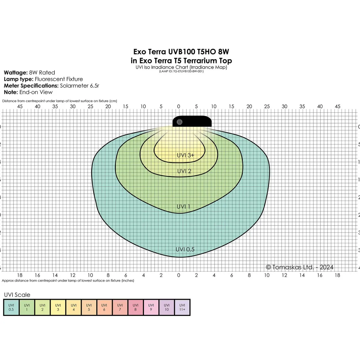 Exo Terra®’s exceptional T5 lamps are crafted in Germany to the highest quality standard, ensuring a prolonged UV output of 12+ months for lasting performance. With its intense output of UVA and UVB rays – combined with a well-balanced visible light spectrum – the Exo Terra® Reptile UVB100 T5 Very High Output Bulb is specifically designed to meet the needs of reptiles, amphibians and invertebrates inhabiting the Cryptophotic Zone. The intensity of the emissions varies depending on the distance from the basking area.