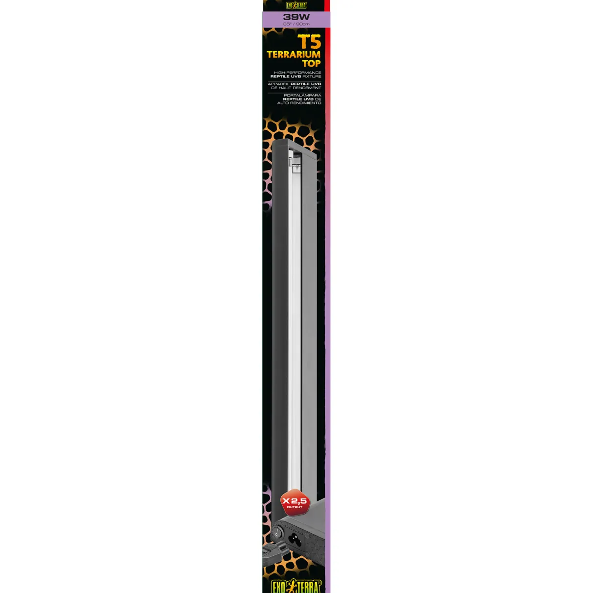 The Exo Terra T5 Terrarium Top High-Performance Reptile UVB Fixture has been specifically developed for use with the Exo Terra Reptile UVB VHO T5 Bulb, but can also be used with any other T5 linear fluorescent bulb of the appropriate wattage. Its elegant and stylish design suits all kinds of terrariums and integrates into any living room. The high-quality electronic ballast eliminates flickering completely and increases the performance and lifespan of any T5 VHO bulb. The Exo Terra T5 Terrarium Top comes with a grounded plug for maximum safety, and is protected against over-voltage, over-current, end of lamp life (EOL) and over-heating. The highly polished reflector increases lamp output 2.5 times! Up to 10 Exo Terra T5 Terrarium Top can be easily linked using the optional grounded interconnection cable. This reduces cable clutter and allows you to control all 10 fixtures via 1 timer.