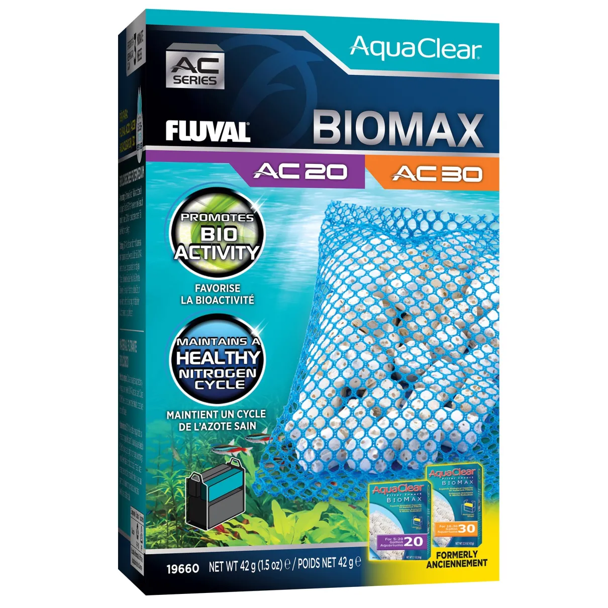 Fluval AquaClear 20/30 BioMax Filter Insert provides an optimal environment for the colonization and growth of beneficial bacteria, which is essential for effective biological filtration and water purification. BioMax’s complex bio-ring pore structure allows beneficial, toxin-reducing bacteria to thrive. By reducing toxins such as ammonia and nitrite, BioMax effectively increases biological filtration efficiency by 30%. Exclusively designed for the AquaClear 30 Power Filter, BioMax is suitable for fresh and saltwater aquariums. BioMax comes in a mesh bag for quick and easy installation.