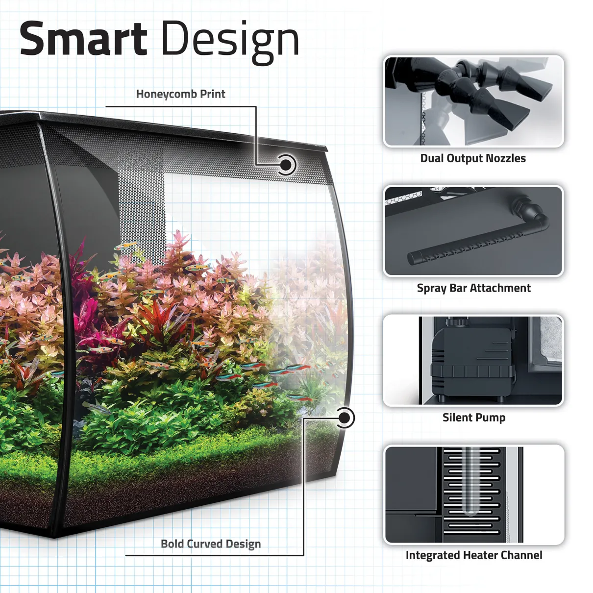 Discover the ultimate in freshwater aquarium design and flexibility with the new and improved Flex 2.0 Series. Imagine customizable RGB + White LED lighting for endless color blends and mesmerizing effects. Picture a reconfigured, integrated filtration system with adaptable water output options. The latest Flex generation makes this a reality and even takes convenience to the next level with several new cover enhancements.