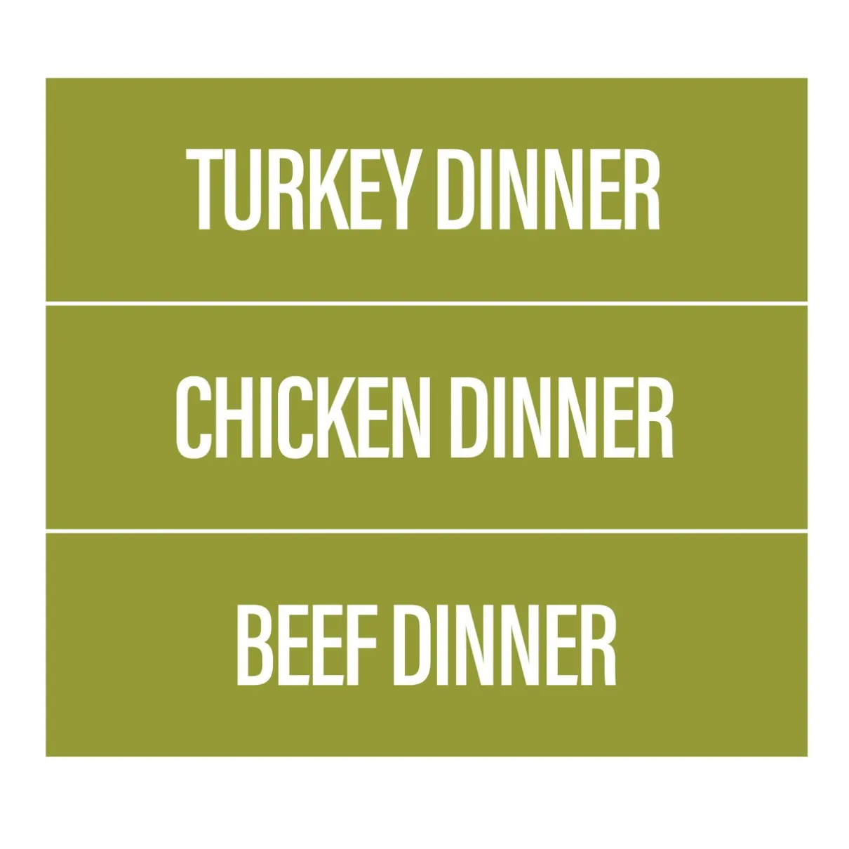 Contains 6 lb of each: Chicken Dinner, Beef Dinner and Turkey Dinner.