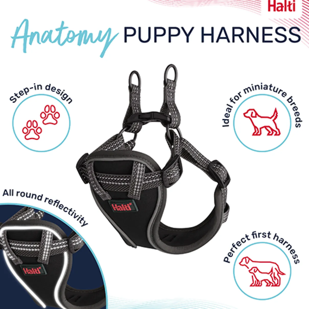 The Halti Anatomy Puppy Harness is the perfect first harness for your puppy but can also be used as a non-restrictive, safe dog harness for miniature dog breeds. Designed with your puppy’s anatomy in mind and through the application of scientific research, it ensures complete freedom of movement while offering four points of adjustment, allowing more adjustment as your puppy grows.