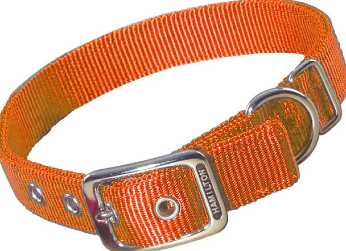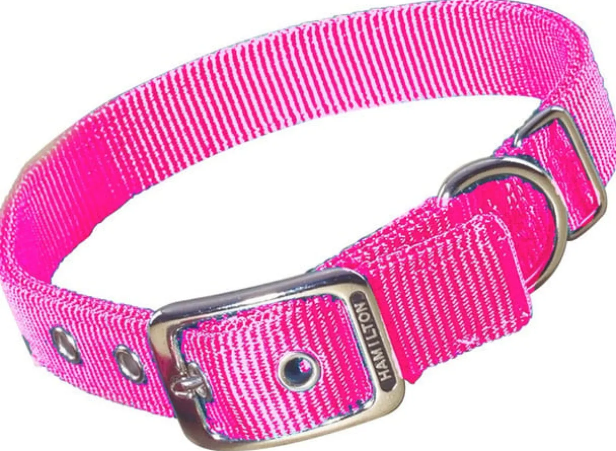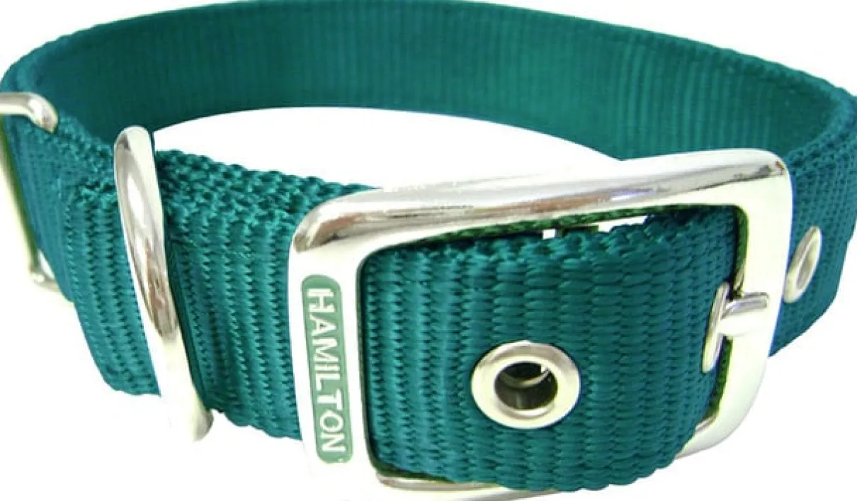 Hamilton 1-inch by 20-inch double thick nylon deluxe dog collar is constructed with custom dyed webbing to reduce fading and bleeding. 100-Percent first run webbing is used to outperform others in strength, flexibility and durability. The high thread count results in an unmatched feel. All cuts are finished away from dog’s neck to avoid irritation. Shoe grade construction eyelets enhance look and eliminate fraying.