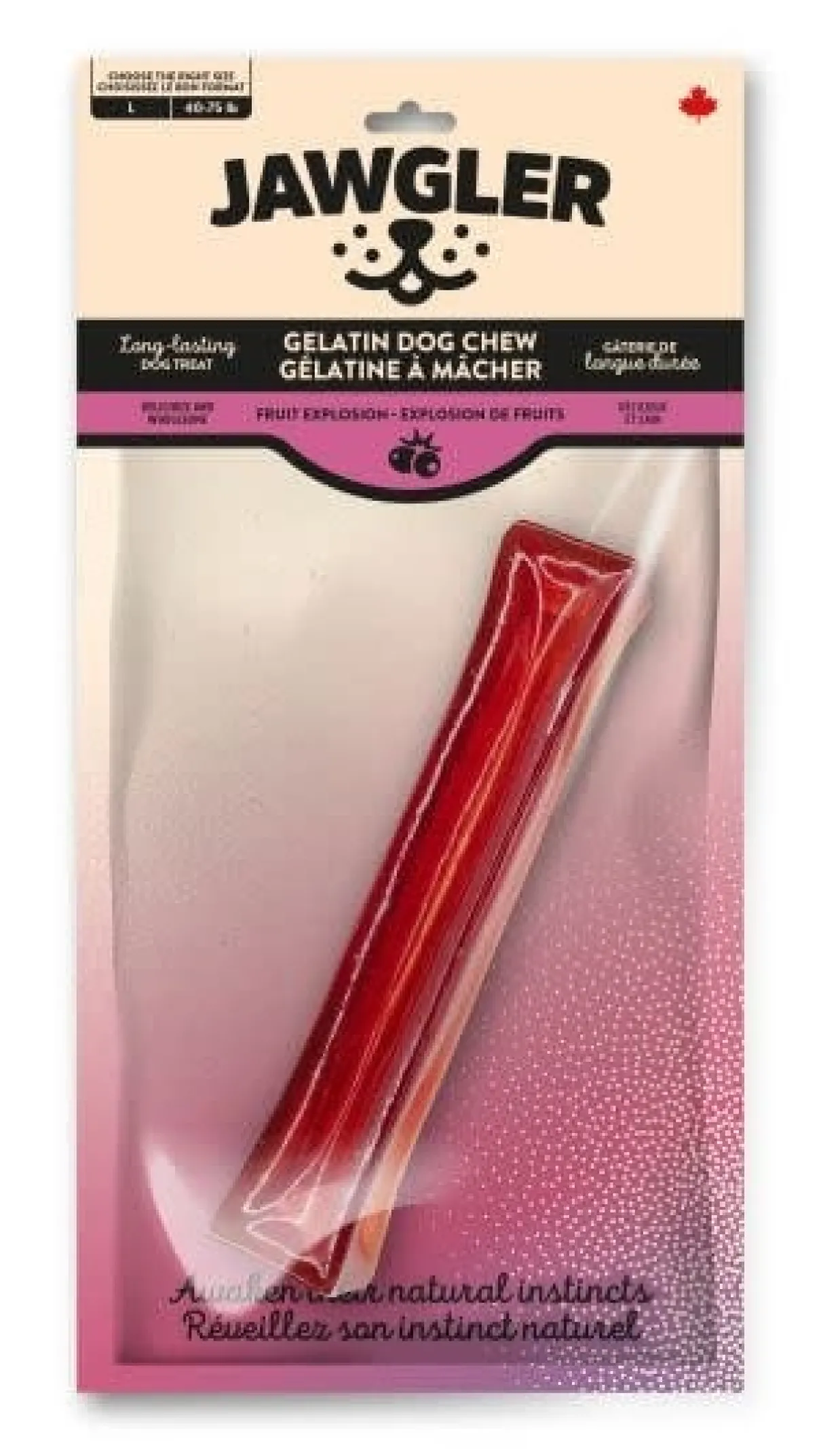 Jawgler Gelatin Dog Chews are made from simple, 100% Quebec-sourced ingredients and a unique protein: gelatin. This pure source of collagen contains over 90% protein and 18 amino acids. With its changing texture, mouthwatering taste, and easy digestibility, this chew is a treat that’s packed with goodness. Even the pickiest of pups will love it!