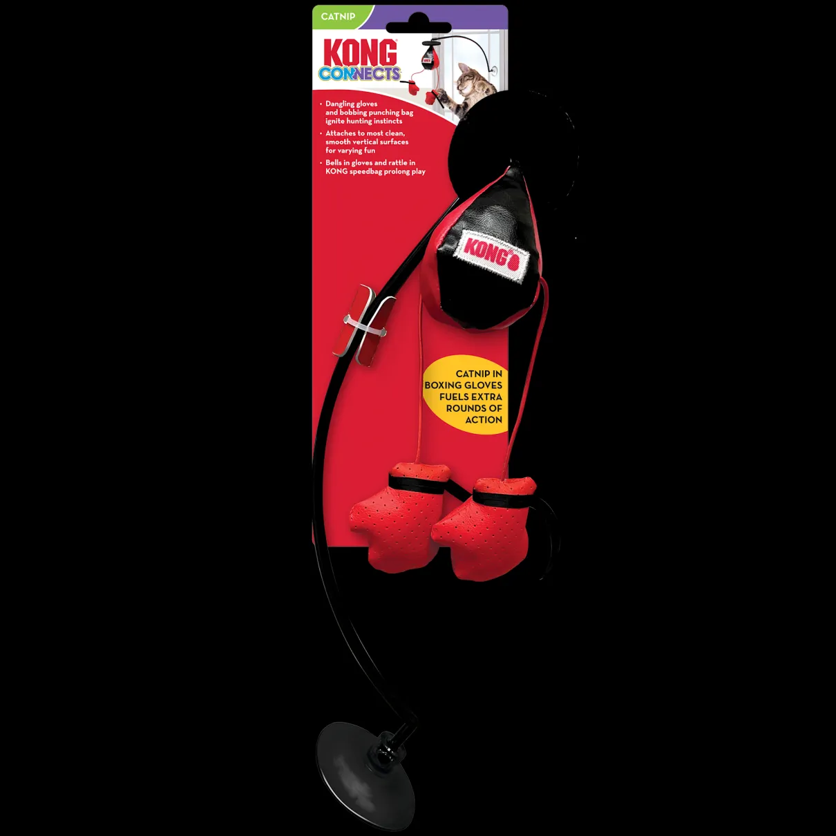 KONG Connects Window Boxing is a portable play gym that knocks out boredom with a multi-sensory prize fight of fun for Kittyweight Champions of the World. Suction cup secures base to any smooth vertical surface. Dynamic Connects Wand enhances irresistible bobbing motion making dangling boxing gloves dance on elastic lines, attracting the eye of the (small) tiger for batting. KONG Premium North American Catnip in gloves fuels extra rounds of fun, while bells and rattle spark hunting instincts.