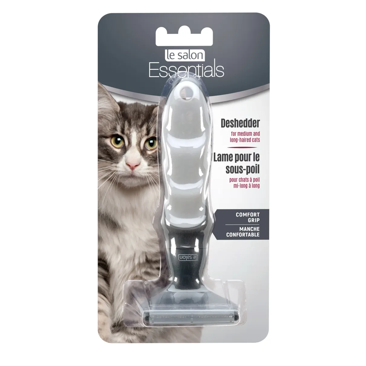 Le Salon Essentials Cat Deshedder with charcoal handle. The deshedder rake is a specialized tool that helps removes mats, and reduces shedding. Recommended for long-haired breeds.