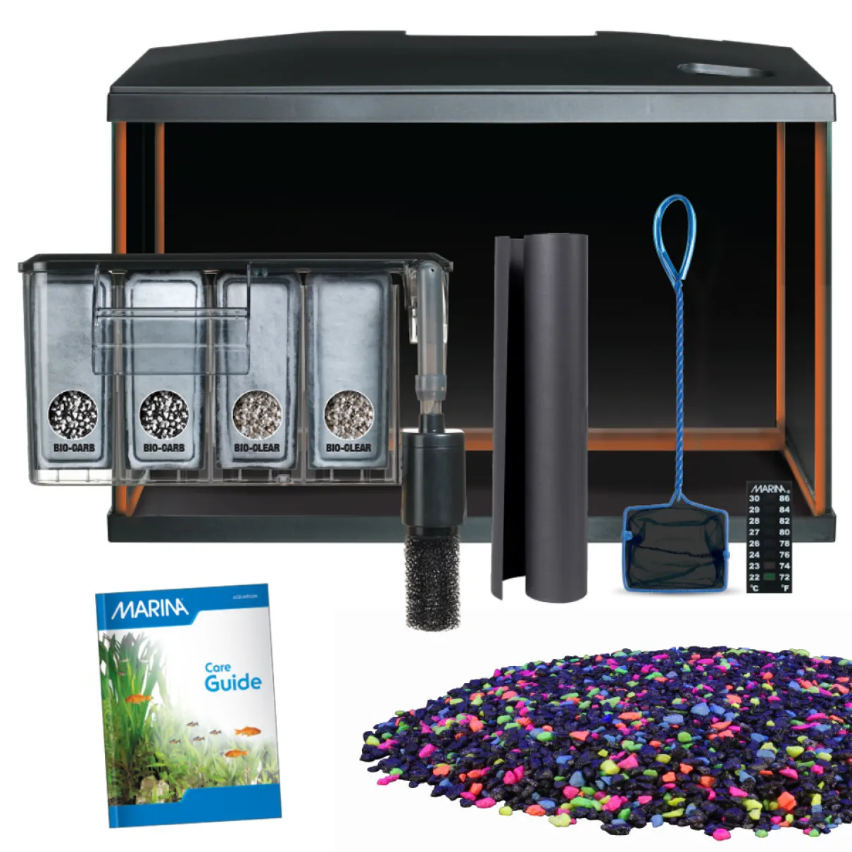 The fully equipped Marina iGlo series accentuates fluorescent colors for a fun glowing effect. The 75 L (20 US gal.) aquarium kit includes unique blue LEDs, orange silicone edging, and Galaxy gravel for maximum fluorescence; while a Marina Slim series power filter offers ultra quiet, effective cleaning, instant start-up and adjustable flow control. Fast change filter media cartridges are included.