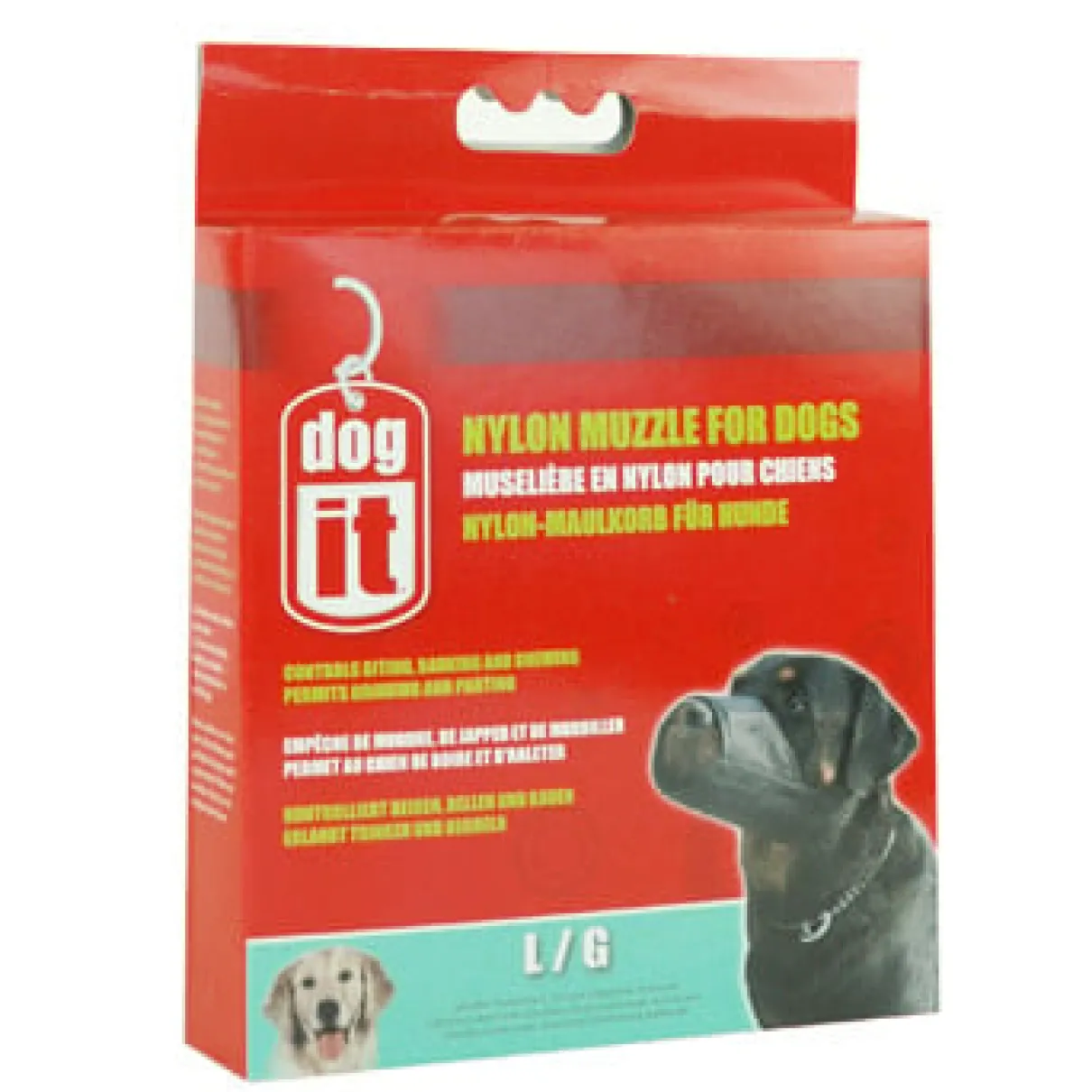 Dogit Nylon Dog Muzzle helps control biting, barking and chewing. Strong, but soft, nylon construction. Can be either machine or hand-washed.