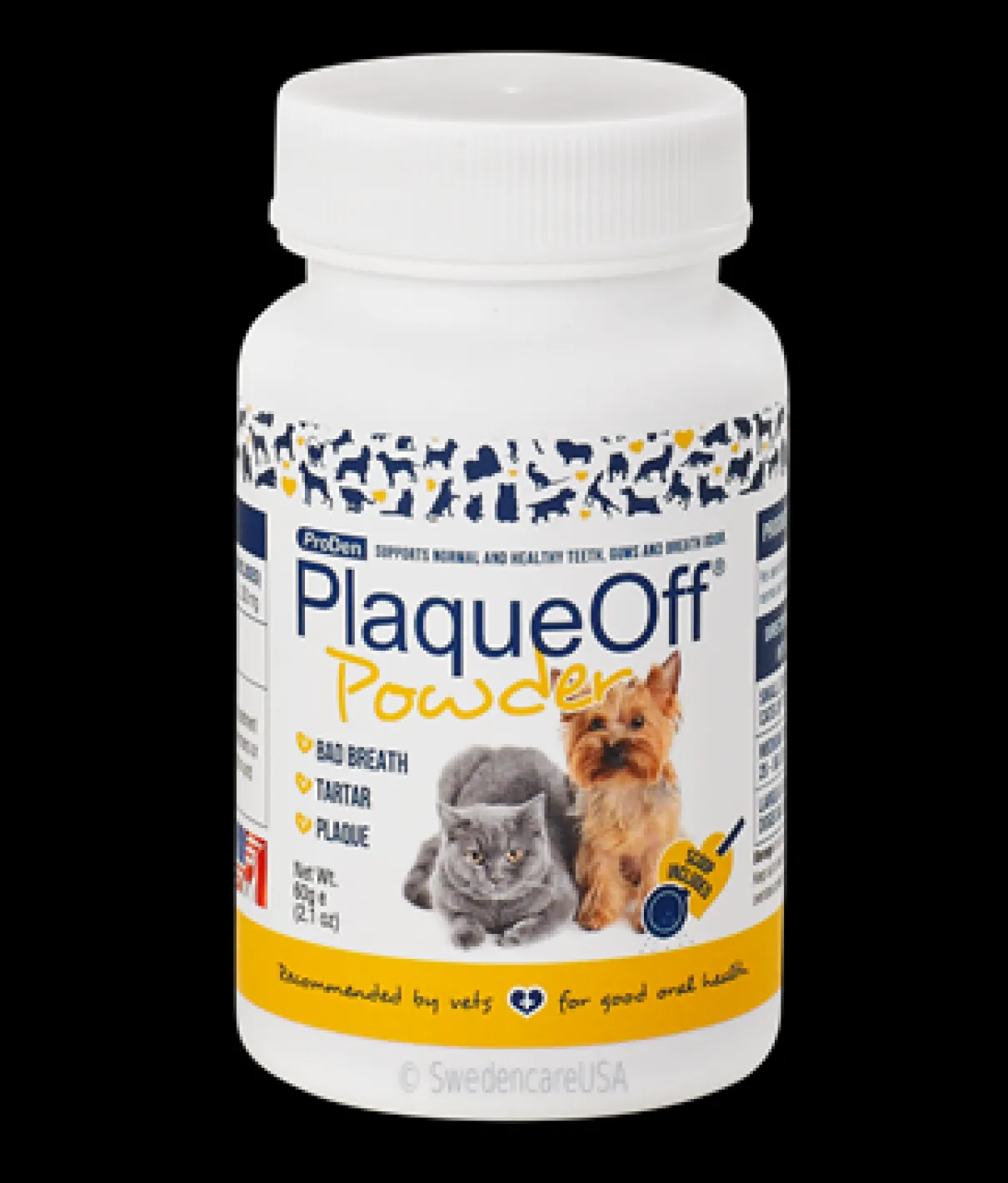 ProDen PlaqueOff® Powder is a 100% natural pet food supplement containing the natural and organic kelp ingredient A.N ProDen™ – shown in clinical trials to help reduce plaque and tartar and to help improve bad breath. The results are usually seen between 3 to 8 weeks, with continued use. Sprinkle the powder over the dog’s ordinary food, wet or dry, once a day with the supplied scoop. The natural kelp ingredient A.N ProDen™ helps control and improve plaque, tartar and bad breath when used as directed.