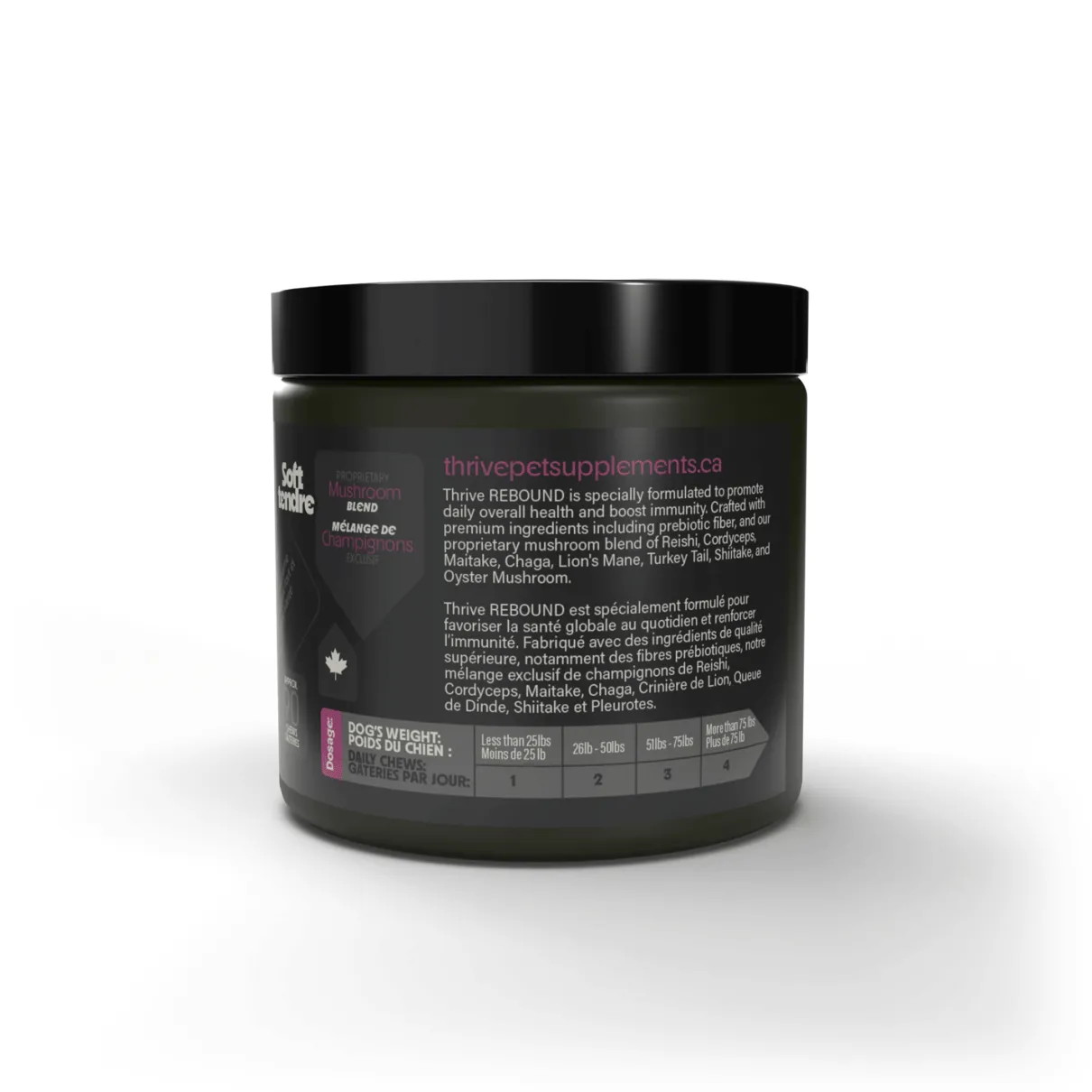 Soft Chew Dog Supplement specifically formulated to promote daily overall health and immunity. Crafted with premium ingredients including Microbuild® and an organic mushroom blend of Reishi, Cordyceps, Maitake, Chaga, Lion’s Mane, Turkey Tail, Shiitake, and Oyster Mushroom all backed by nutritional science, research, and testing.