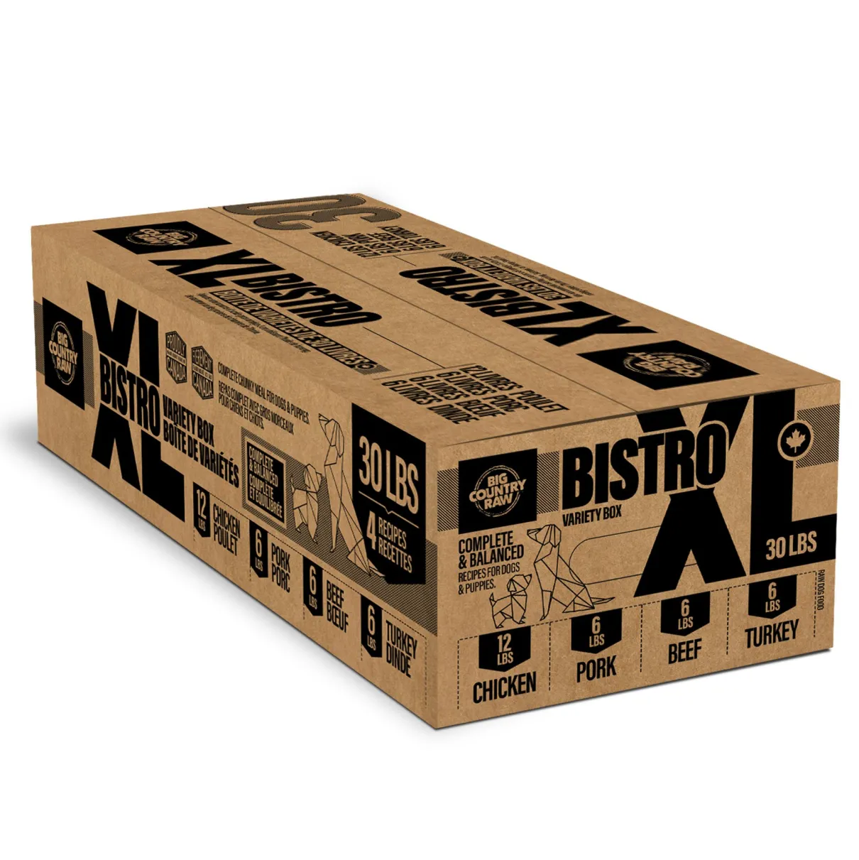 The ultimate variety box – offering 4 proteins! Each box contains 12 lbs of XL Chicken, 6 lbs of XL Turkey, 6 lbs XL Beef and 6 lbs XL Pork. XL Turkey and XL Pork are ONLY available in the Bistro box.